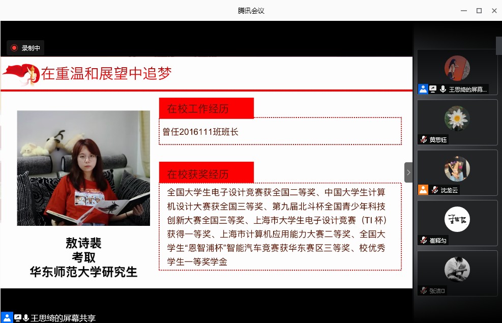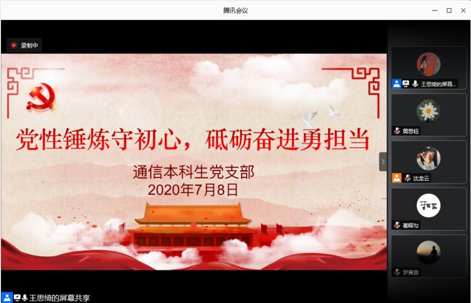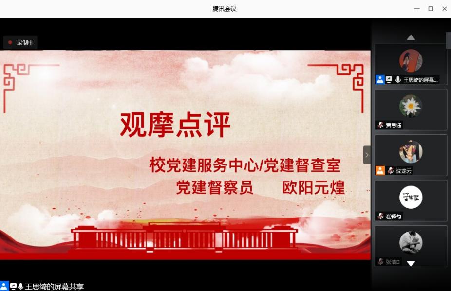 本次专题组织生活会分别从:“一图一故事”—学习新中国史,汲取信仰之力;“在重温与展望中追梦”—担当时代使命,使命勇担在肩;“观看毕业生短片”—致敬四年青春,矢志永远奋斗三个部分展开。围绕新中国史的学习,结合毕业生党员的离校感悟,锤炼党性修养,汲取精神力量。