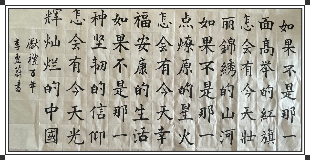 活动的第二项任务是完成一首献礼百年的诗歌创作,“风一更,雨一更,一百年风雨历程,思一生,念一声,想着你热血沸腾,如果不是那一面高举的红旗,怎会有今天壮丽锦绣的山河……”、“这一首赞歌,为你唱了100年,都没唱够……”金色的阳光洒在同学们的脸上,百名师生齐声朗诵自己创作的诗歌《百年赞歌》,更加坚定了心中光辉的信仰,引导自己前行的步伐,向中国共产党的百年风雨历程致敬,向中国共产党诞辰100周年致敬!