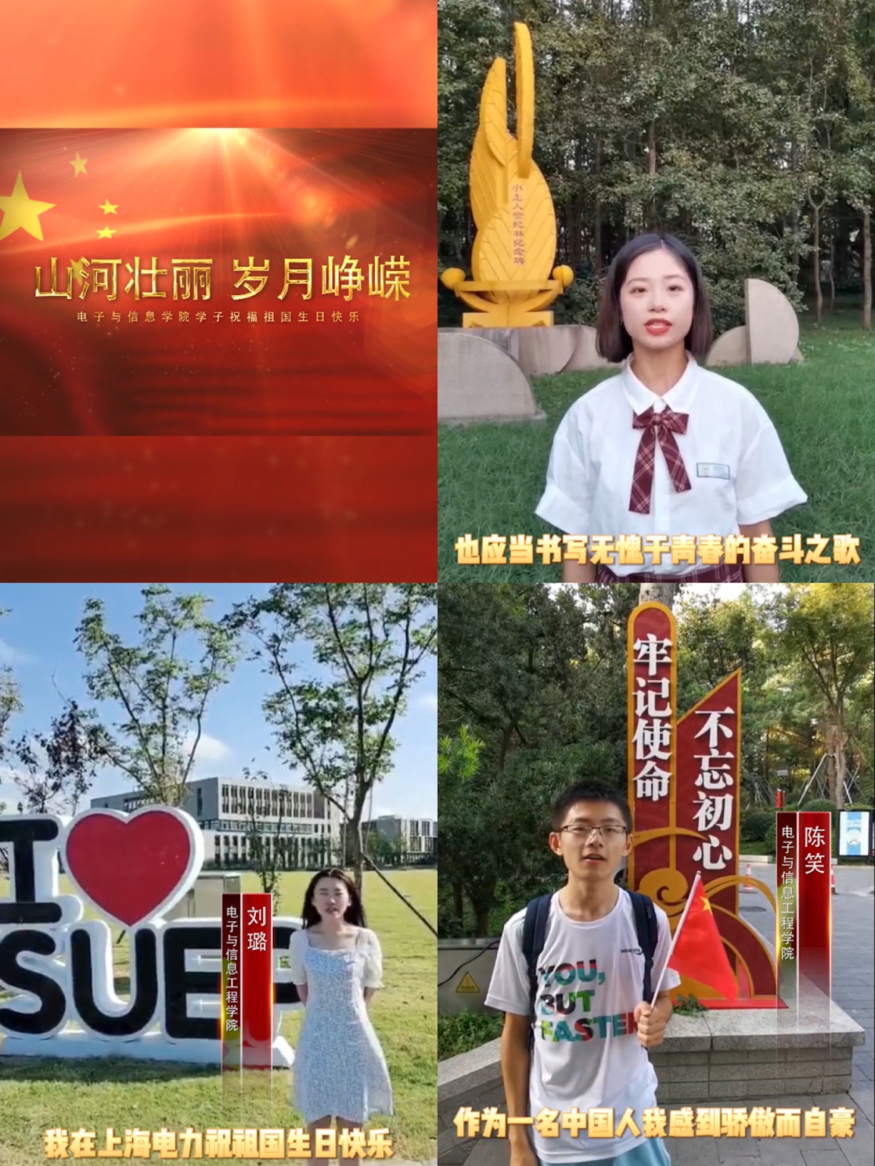 为庆祝新中国成立72周年,迎接公司70周年校庆,抒发电信学子爱党爱国爱校情怀,展示蓬勃向上的精神风貌,十一期间公司组织“深情向祖国告白,献礼上电70周年”主题短视频征集活动,同学们向祖国72周年华诞和上电70周年华诞纷纷送上了自己的祝福,祝福祖国繁荣昌盛,祝福公司桃李天下,通过活动的参与,展现了同学们感恩母校,热爱祖国的真情实感。