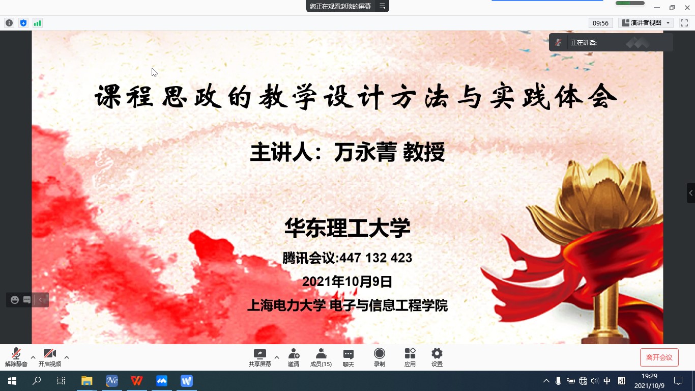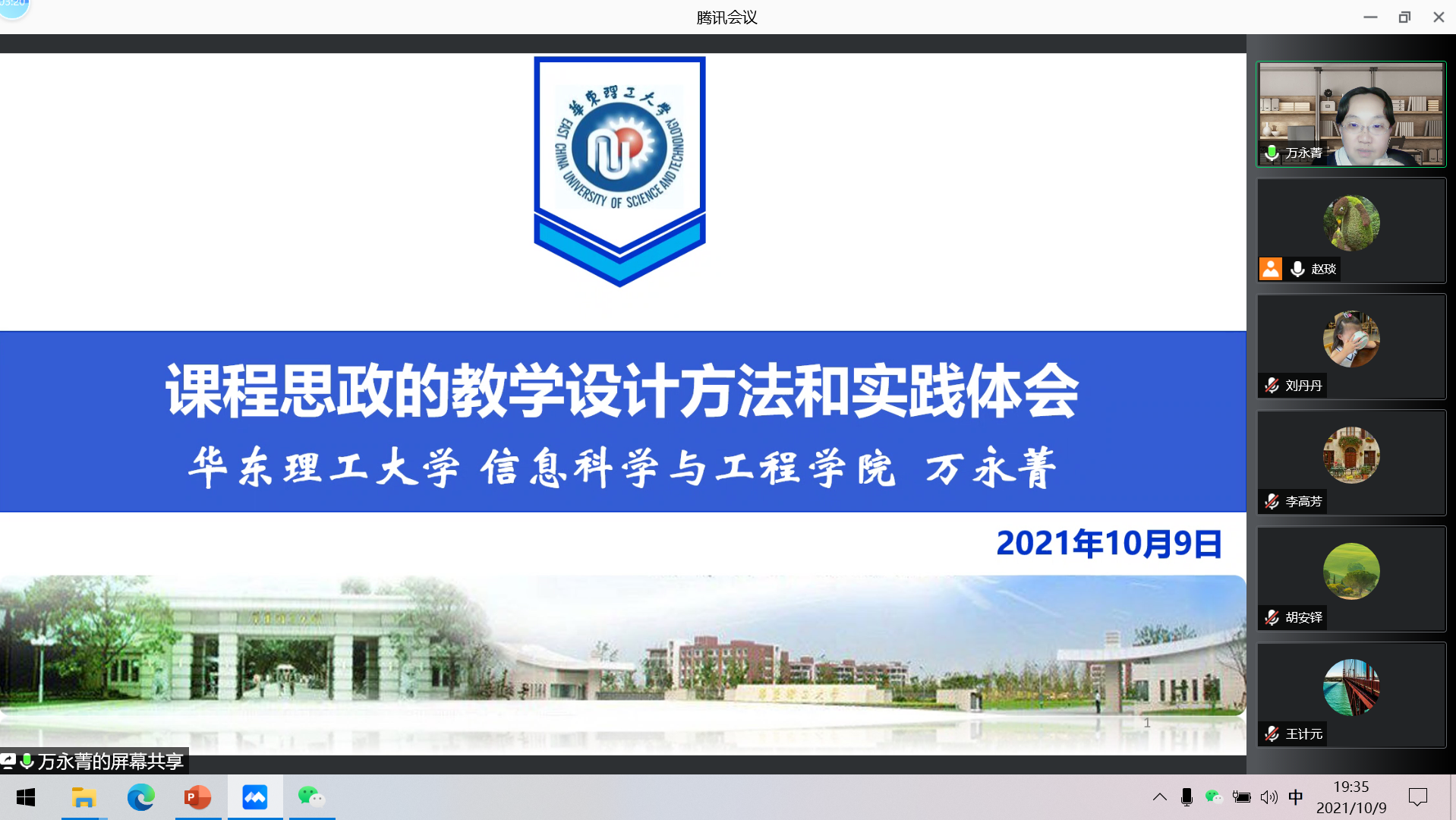 为了推进公司各专业课程思政建设,10月9日晚,3044AM永利邀请教育部教学名师、华东理工大学教务处副处长万永菁教授做了题目为“课程思政的教学设计方法与实践体会”的线上报告。公司领导及专业教师参加了报告会,赵琰副经理主持会议。