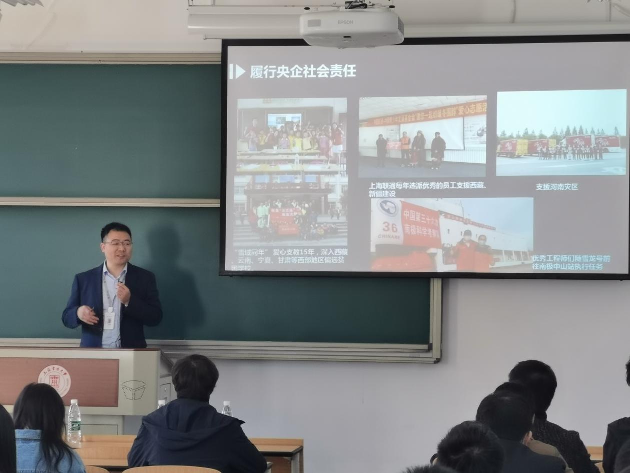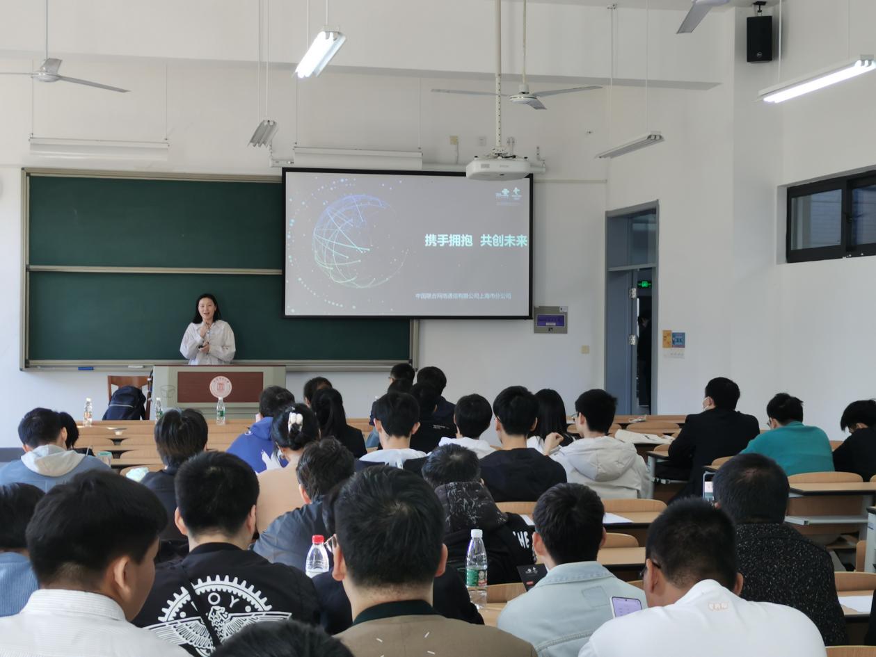 会议伊始,于伟明向同学们介绍了中国联通的业务概况。中国联合通信有限公司成立于1994年7月,原中国网络通讯集团有限公司与原中国联合通信有限公司于2008年10月15日正式合并成为中国联合通信有线公司,2017年8月中国联合网络通信有限公司完成中央企业整体混合改制,面向阿里、腾讯、京东、百度等优质企业开放部分股份。“携手拥抱,共创未来” 上海联通经过多年的快速发展和战略布局,业务转型已经迈出坚实步伐,抢先在“云、大、物、智、安”等新兴领域进行布局,深度参与上海智慧城市建设和数字转型,持续锻造核心自主能力,初步建成了以5G为引领的新一代信息基础设施的网络能力底座。