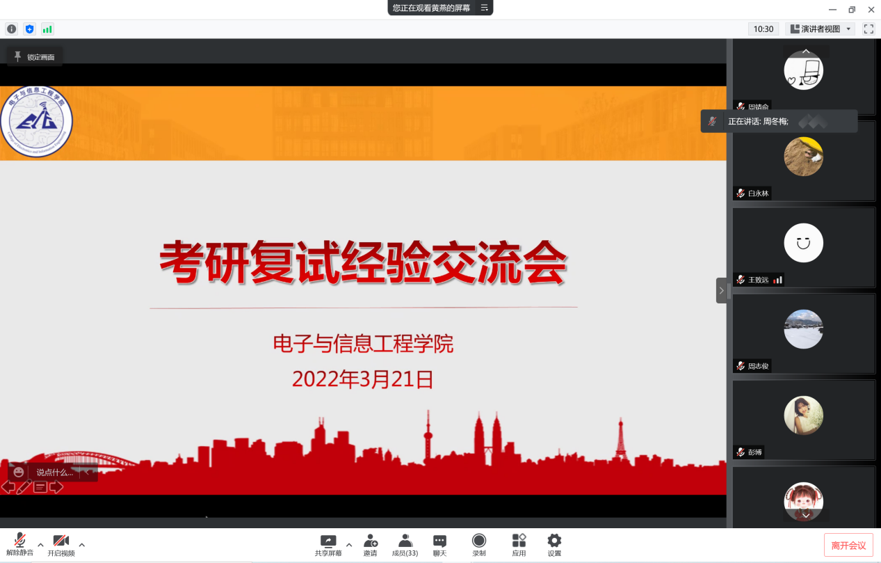 抗疫不停学,在这段特殊时期,为了使进入考研复试的同学掌握更多相关技巧,以良好的状态备战复试,3044AM永利于3月21日晚上7:00举办了线上“考研复试经验交流会”。公司党委副书记周冬梅、光电科学与信息工程专业教师薛亮、就业专项负责人黄燕、毕业班辅导员许晓天、崔释匀参会。会议还邀请了往届优秀学子进行分享。