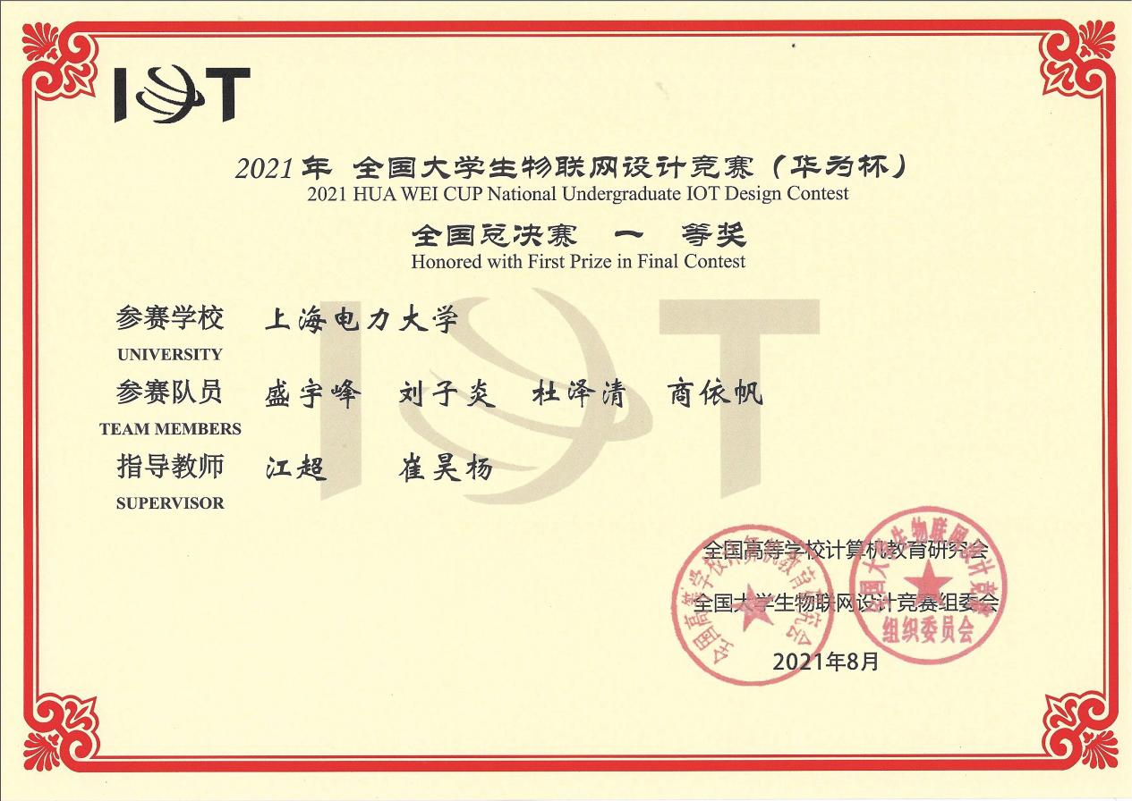 由华为技术有限公司冠名赞助的2021年全国老员工物联网设计竞赛(华为杯)共吸引了来自571所高校的1475支队伍,参赛员工规模达6945名,指导教师1461名。由电信公司盛宇峰、刘子炎、杜泽清、商依帆同学组成,江超老师、崔昊杨教授指导的“空天地立体化智慧电网线路守卫者”小组通过选择自主命题赛道,一路过关斩将,杀入全国总决赛,并与145支参赛队伍通过在线视频答辩、6强争霸等环节展开了最后的角逐。在经过国内几十所高校和企业的32位评审专家严格细致的把关后,成功获得全国一等奖。