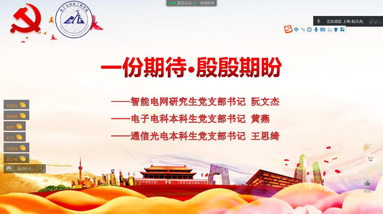 一份祝福·寄语母校。毕业生党员代表陈婷、杨志鹏、潘威宇、王致远、彭博、火凌芸等围绕“党支部工作、疫情防控、社会实践、就业经验”等方面分享了自己的感悟和体会,感恩母校的教育和培养。他们代表全体毕业生党员表示将始终牢记党员身份,保持“站在前、走在前、干在前”的先锋姿态,不负公司和老师的嘱托,努力奋斗,争创佳绩,肩负起新时代青年的使命与担当。低年级党员也通过视频寄语的形式,为学长学姐们送上深情祝福。