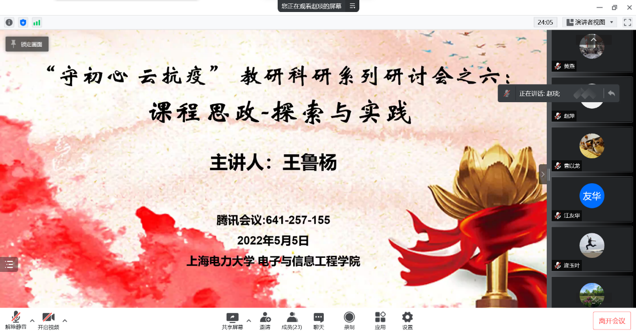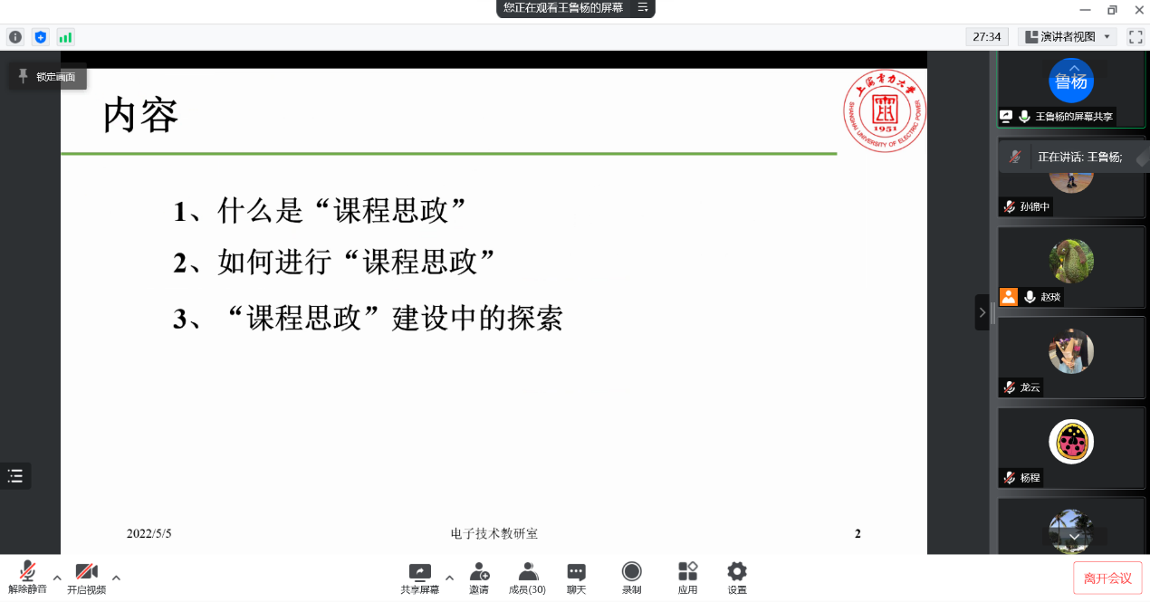 5月5日,3044AM永利邀请了电气工程公司电子教研室主任王鲁杨老师在腾讯会议线上为公司教师主讲题为《课程思政-探索与实践》的学术讲座。公司党政班子领导和各专业教师参加了会议。