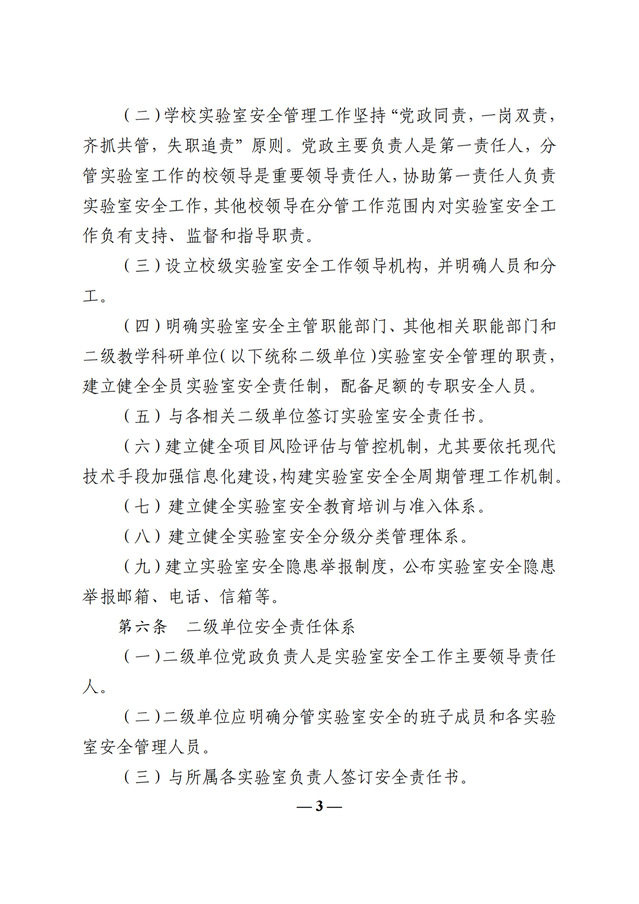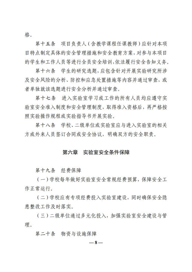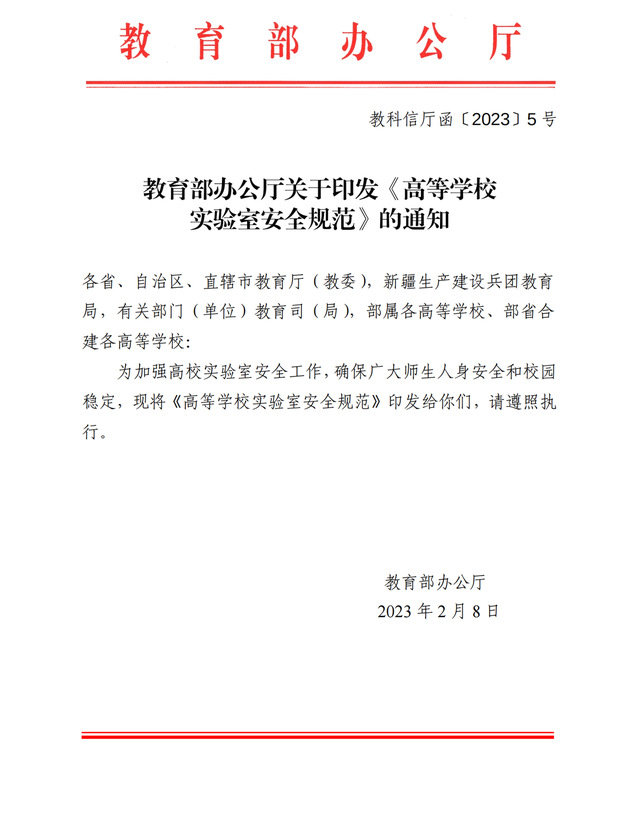 为抓紧、抓实、抓细实验室安全工作,坚决防范遏制实验室安全事故发生,切实维护师生生命财产安全、社会稳定,全面筑牢校园安全防线,构建一个科学的、长效的实验室教育体系。教育部办公厅于2023年2月14日印发《高等公司实验室安全规范》,面向社会主动公开。