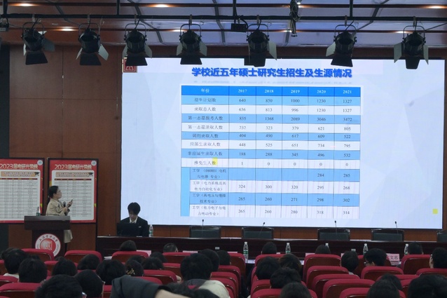 公司党委委员蒋伟介绍了2023年本校硕士研究生招生和生源情况,并分析了近几年一志愿分数线和调剂分数线及其变动情况。还重点分析了公司学术型学位点和专业型学位点,为同学们在专业选择方面提供了指导。