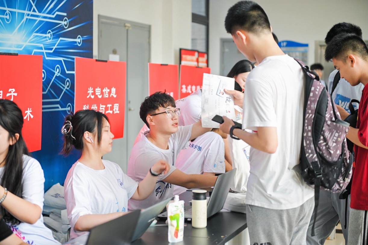 热情周到,暖新生。新生报到处井然有序,满怀热情的新生班助们早早做好准备,等待新生的到来,班助们认真检查每一份资料,细心核对相关手续,耐心为同学们解答疑问,亲切的话语中饱含着对新生的热忱关怀,报到工作有条不紊,2023级新同学们成功解锁“上电人”的崭新身份。