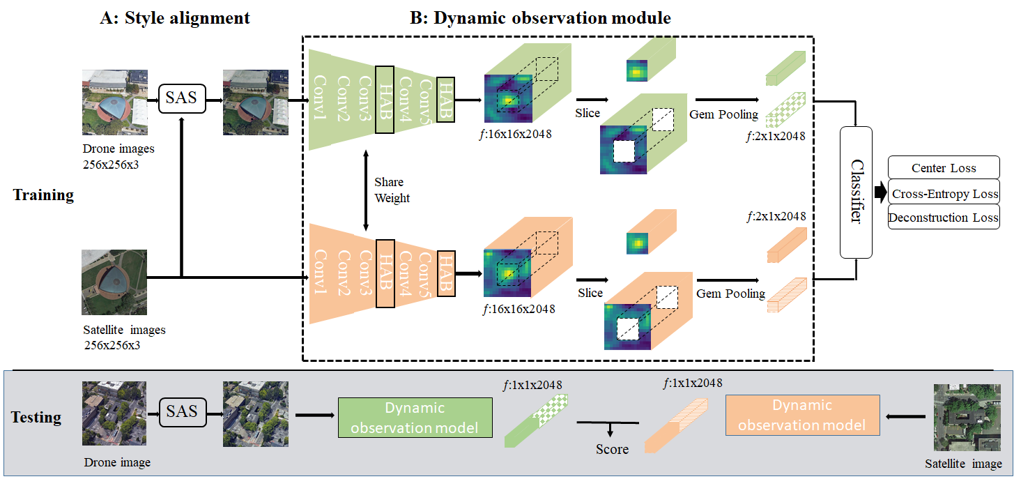 该论文提出了一种基于风格对齐的无人机视图地理重定位动态观测方法,来应对不同视图之间的视觉风格差异和环境噪声带来的影响。论文引入了一种风格对齐策略(SAS),将无人机图像的多样的视觉风格转换为统一的卫星图像视觉风格。同时设计了一个动态观测模块,通过模仿人类的观测习惯来评估图像的空间信息分布,它的特点是采用双形方环分块策略加以层级注意力机制模块(HAB),以减少周围噪声和地理变形。此外,还引入了一种解构损失,通过对分类器预测向量的相关性计算进一步促进学习同时弥补了交叉熵损失的缺陷。实验结果表明,该方法在基准数据集上具有一流的性能。