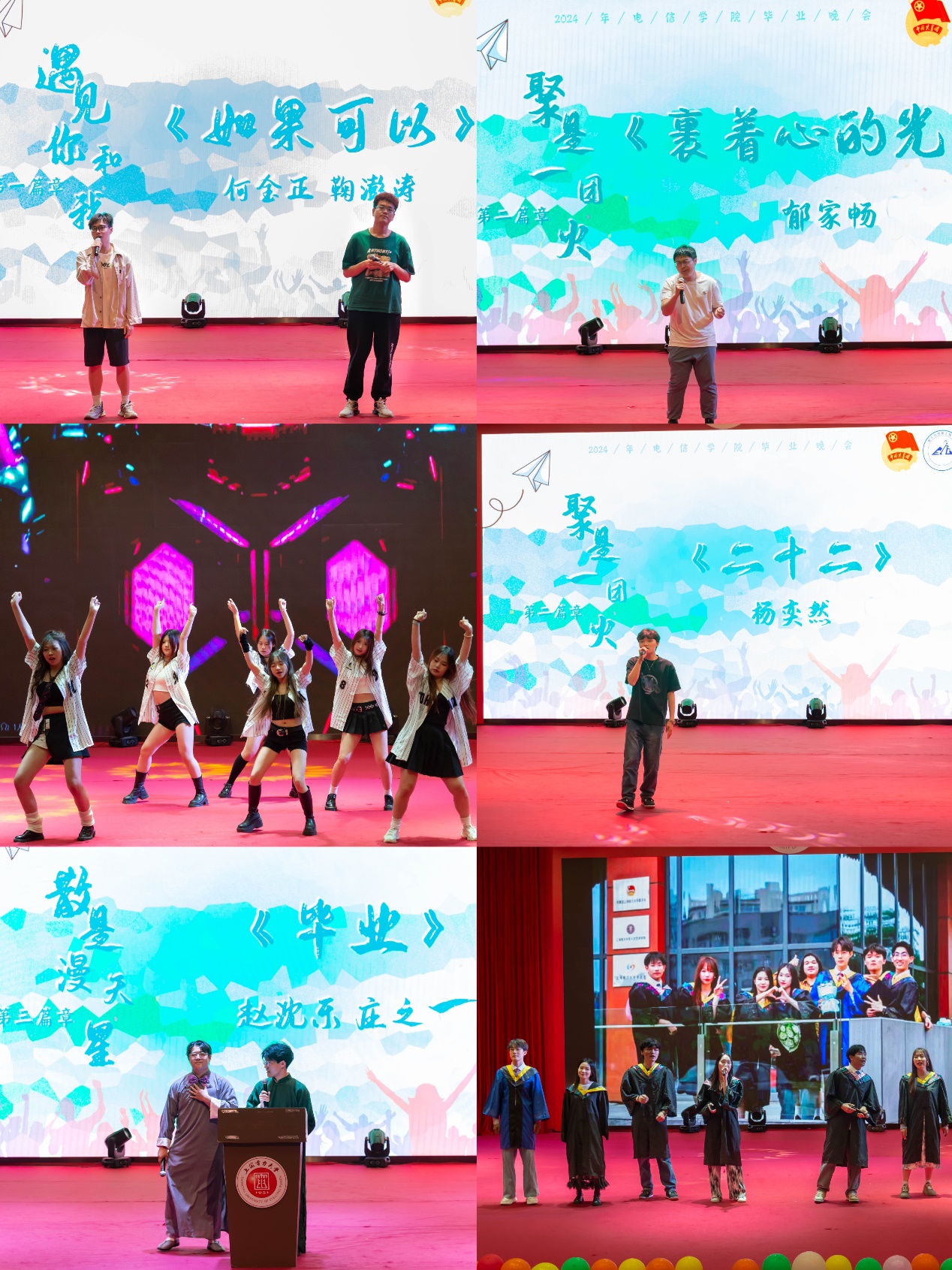 晚会播放了《我们的青春不散场》毕业季视频,承载着大学四年难忘的青春。麦田音乐社带来开场歌曲《我们在乎你》,激情澎湃、活力四射;歌曲《如果可以》真挚动人;《二十二》完美契合毕业主题,让毕业生们感受到时光的珍贵。街舞社带来的街舞《batter   up》精彩纷呈,劲爆的节奏,动感的节拍,舞动的身影完美诠释了青春意义。歌曲《裹着心的光》走进治愈的追梦旅程;《最后一页》深情动人,鼓励毕业生们在未来的日子里更勇敢面对挑战和困难。舞台剧《毕业》用诙谐幽默的方式,回顾了老员工活的点点滴滴。最后的歌曲串烧《我们已相遇365天》更是让现场毕业生们怀念最初相遇的时光。