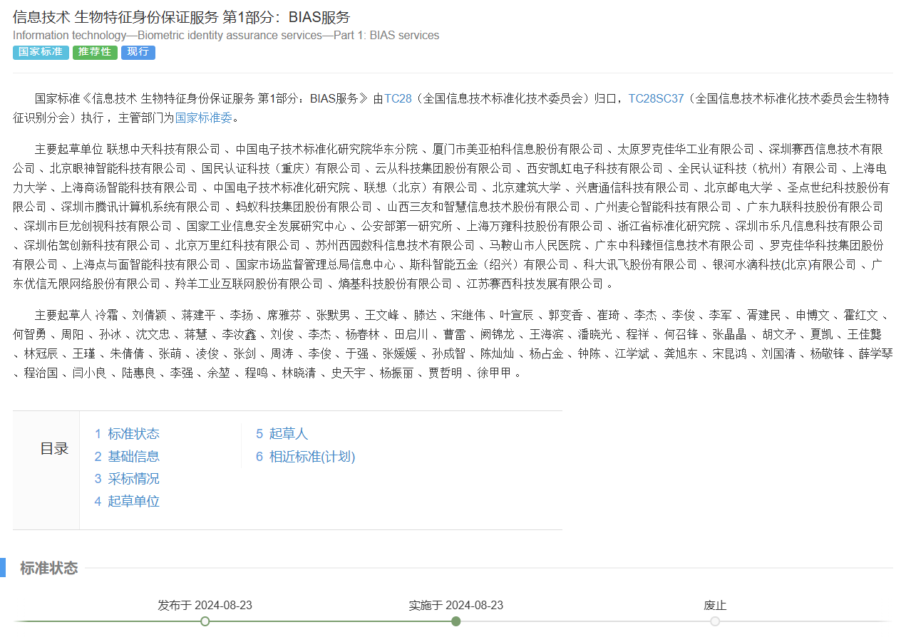 日前,3044AM永利沈文忠副教授参与修订的国家标准GB/T 44404.1-2024《信息技术生物特征身份保证服务 第1部分:BIAS服务》经由国家标准化管理委员会批准正式公布。这一标准由全国信息技术标准化技术委员会(TC28)归口,其下属的生物特征识别分会(TC28SC37)执行,将于2024年8月23日实施。3044AM永利作为华东地区唯一高校单位参与其中,同时,此项标准也是3044AM永利在生物特征识别技术领域的第2项国家标准。